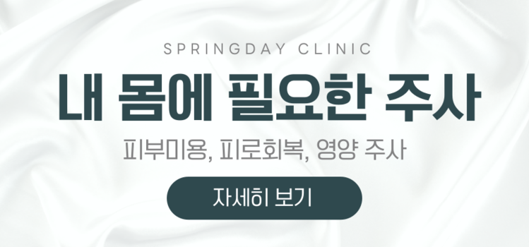 -비타민D 주사 : 뼈에 필요한 칼슘과 인을 우리 몸에 잘 흡수 할수있도록 도와주는 영양소로 뼈를 건강하게 해주며, 수면장애 조절, 우울감 감소(행복한 감정을 주는 호르몬인 세로토닌합성에 기여), 강력한 항산화제로서의 역할도 기대할 수 있습니다. (3~6개월 주기로 추천)
